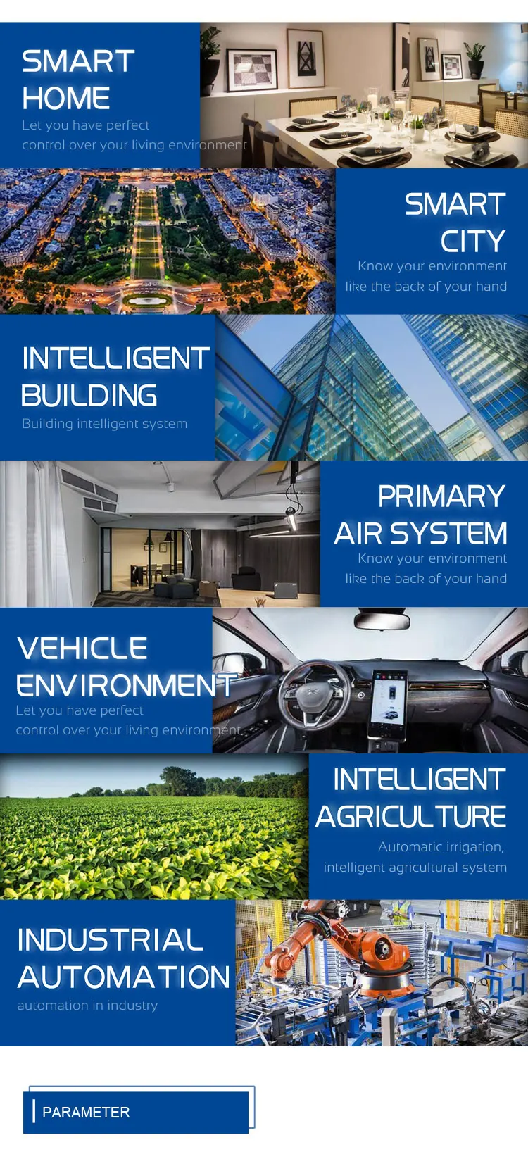 주요 제품:온도 및 습도 센서, 가스 센서, 수질 센서, 수위 센서, 먼지 센서, 조도 센서, 초음파 센서, 레이저 센서, 적외선 센서, 전류 센서, 릴레이 모듈, 개발 보드 통신 모듈, 전자 모듈, 전원 모듈, 다른 액세서리 등.